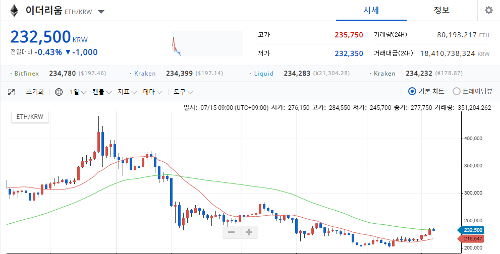 이더리움 시세는 업비트 기준으로 232,500원에 거래되고 있습니다.