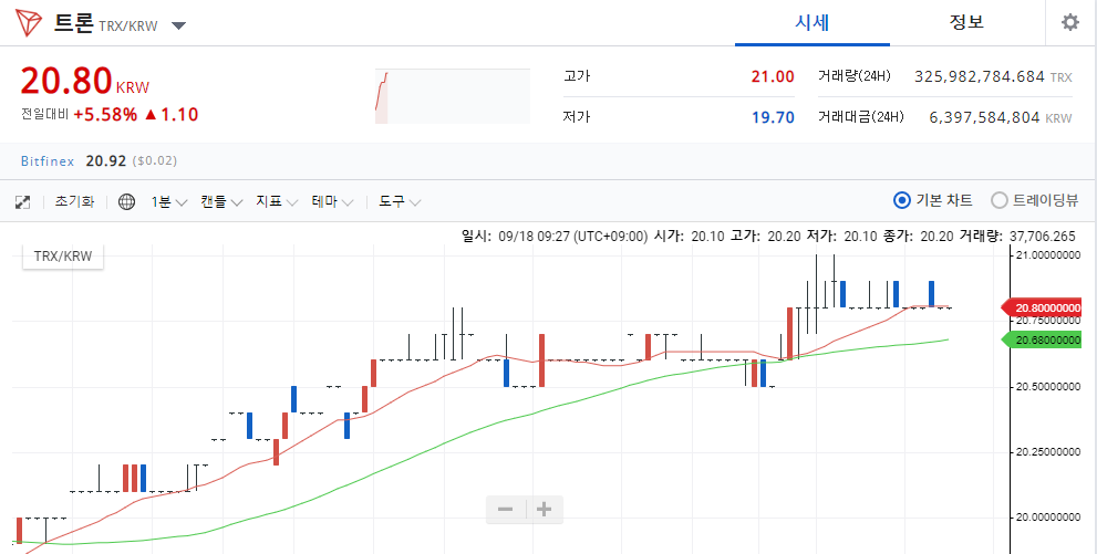 트론 코인 시세는 업비트 기준 20.8원에 거래되고 있습니다.