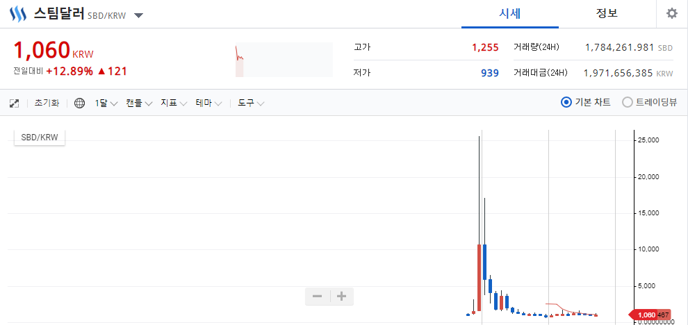스팀달러 코인 시세는 업비트 기준 1,060원에 거래되고 있습니다.