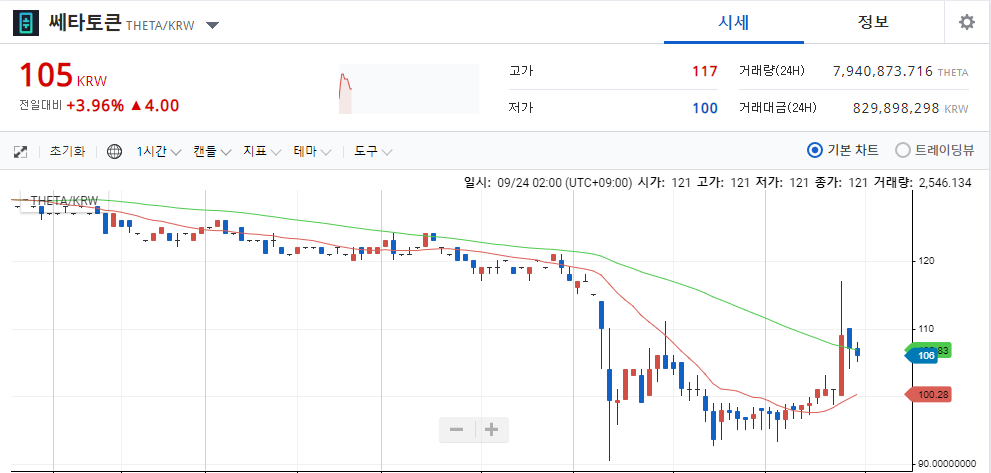 쎄타토큰 시세는 업비트 기준으로 106원에 거래되고 있습니다.