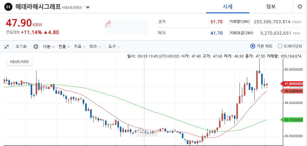 헤데라 해시그래프는 업비트를 기준으로 47.9원에 거래되고 있습니다.