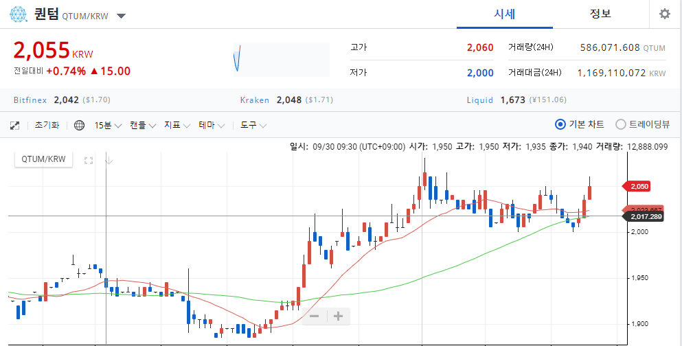 퀀텀 코인 시세는 업비트 기준으로 2,050원에 거래되고 있습니다.