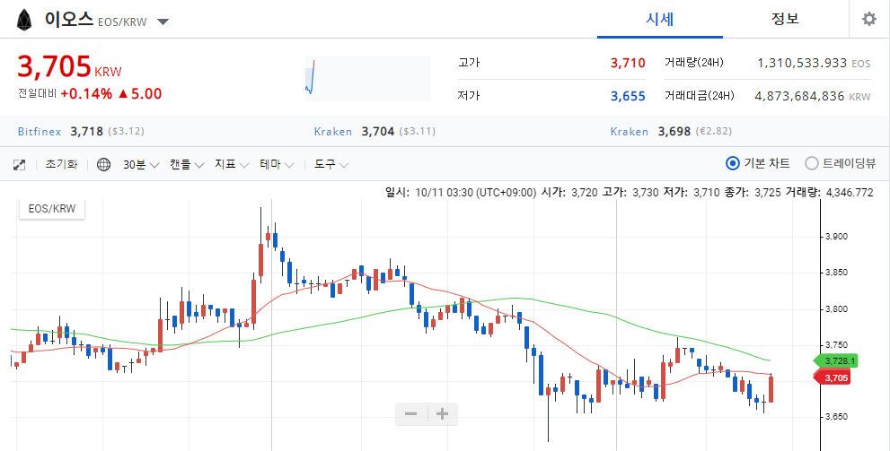 이오스 코인 시세는 업비트 기준으로 3,705원에 거래되고 있습니다.