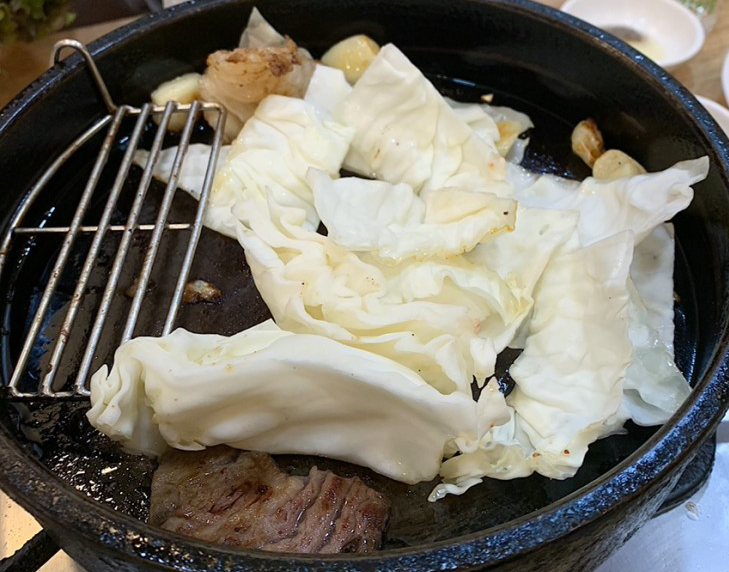 소기름이 흥건한 주물에 양배추를 굽다보면 기름은 기름대로 먹지만 느끼함을 잘 잡아주죠.