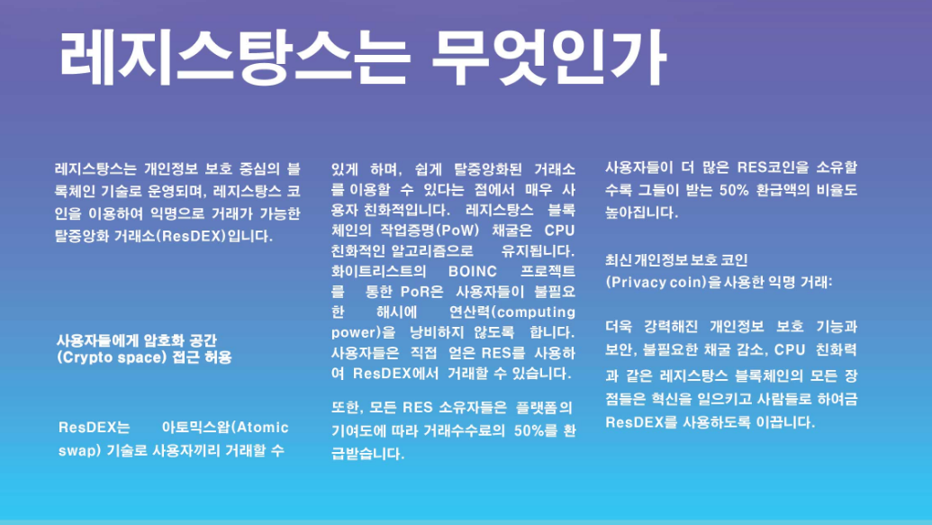 블록체인 기반으로 생성되었습니다. 또한 이 코인을 이용하여 탈중앙화 거래소를 통해 거래가 가능하다는 설명도 있습니다. 레지스탕스 코인이 말하는 탈중앙화 거래소는 아토믹스왑을 통해 누구나 자유롭게 거래가 가능하고 안전한