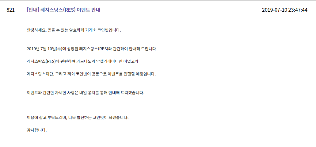 큰 축하를 드리고 싶군요. 레지스탕스 코인은 코인빗 거래소에서 진행하는 라이징 이벤트의 일환으로