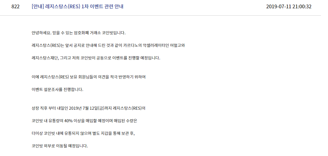 이벤트의 자세한 내용은 아직 공지하지 않았지만 코인빗은 레지스탕스 코인 유통량의 40 퍼센트 이상을 매입 할