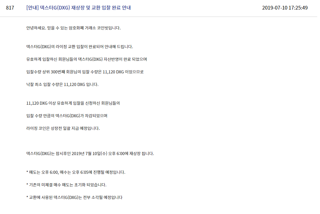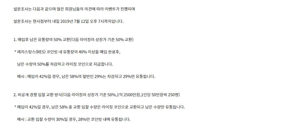 예정임과 동시에 매인된 수량은 코인빗 외부로 이동시켜 코인빗에서는 유통되지 못하게 한다는 내용이 추가 되었습니다. 또한 매입후 남은 유통량의 50 퍼센트는 교환을 진행하게 되며 라이징 코인으로 지급을 진행한다고 밝혔습니다.