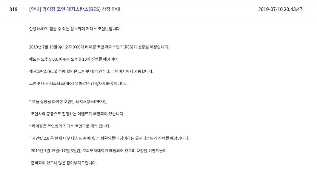 레지스탕스 코인은 코인빗 거래소의 라이징 이벤트를 대비한 코인으로도 알려져 있습니다. 첫번째 라이징 코인은 유소싱이라는 코인인데 생방송으로 추첨을 통해 입찰했던 방식과는 다르게 거래량을 바탕으로 입찰을 진행했습니다.