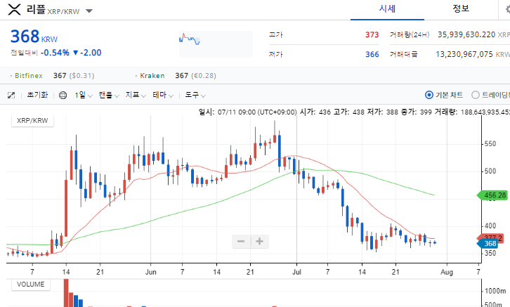 리플은 현재 367원에 거래가되고 있는데 상당기간 이 시세에서 길게 횡보하는 중입니다.