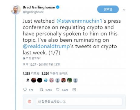 미국 재무부 장관의 발언 중 암호화폐는 법정통화를 대체할수 없다는 발언에도 동의한다고 밝히기도 했습니다.