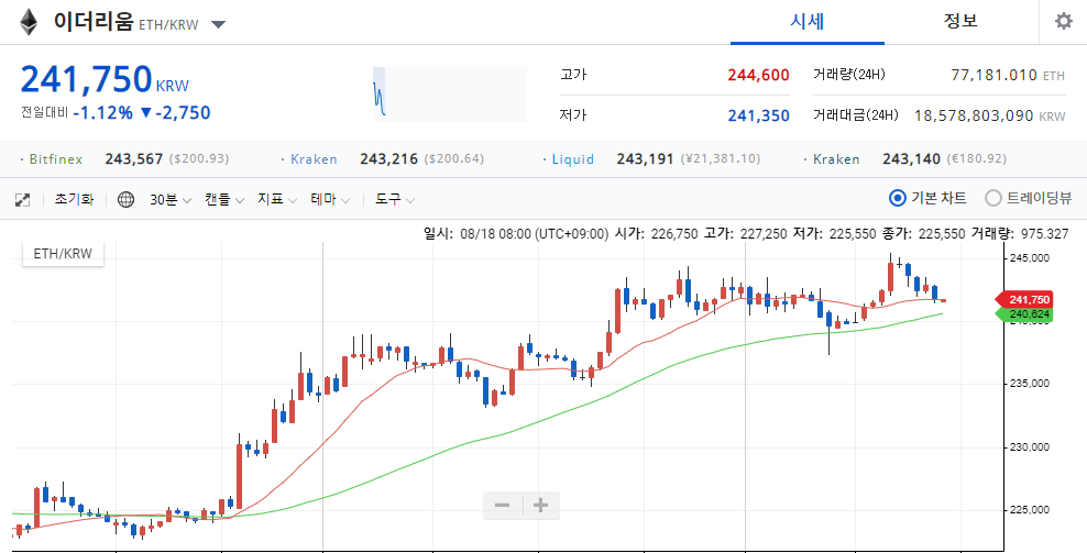 이더리움 시세입니다. 업비트 거래소에서 241,750원에 거래되고 있으며 조금씩