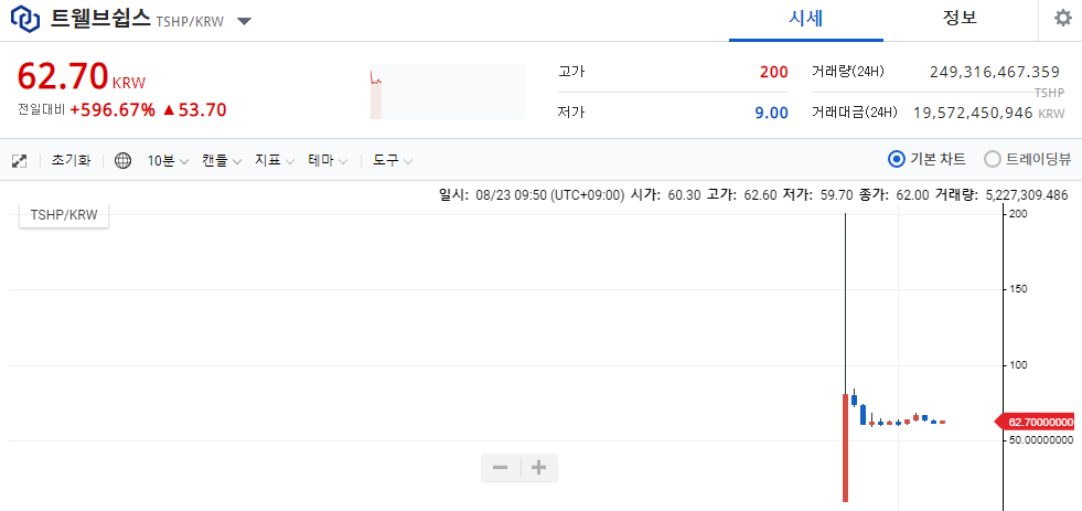 트웰브쉽스 코인 시세는 62.7원으로 순탄을 넘어서서 굉장히 핫하게 출발했고