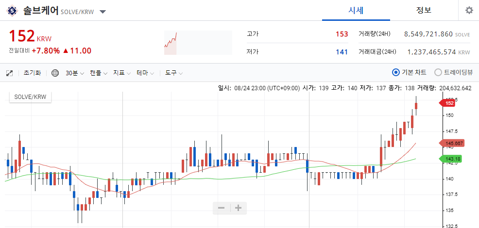 솔브케어는 업비트에서 약 152원에 거래되고 있으며,