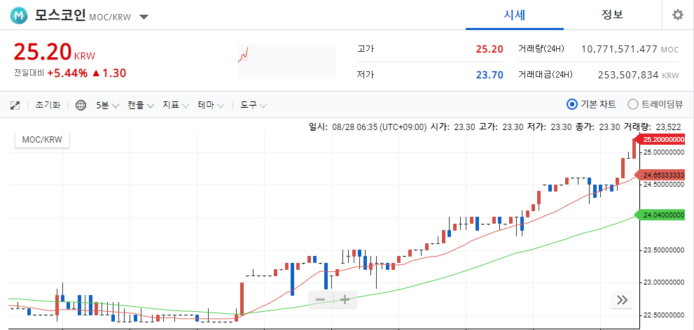 모스코인 시세는 업비트 기준으로 25원에 거래되고 있는걸 확인할 수 있습니다.