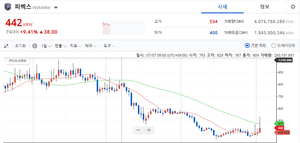 피벡스 코인 시세는 업비트 기준으로 442원에 거래되고 있으며, 한 차례 가격대가 크게 꺾인 이 후로